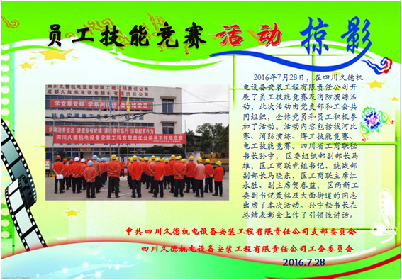 根据区委组织部《关于开展“美丽成都·党员示范行动”的意见》及 党支部“两学一做”学习教育活动安排,为进一步提升公司员工业务技能,推进“八精堂”管理,培训“久德工匠”,营造比学赶帮超的良好氛围,按照久党字〔2016〕6号《关于公司党支部委员会、工会委员会组织开展员工技能竞赛暨消防演练活动的通知》要求,在全公司范围内开展了员工技能比武及消防演练活动,现将有关情况通报如下: