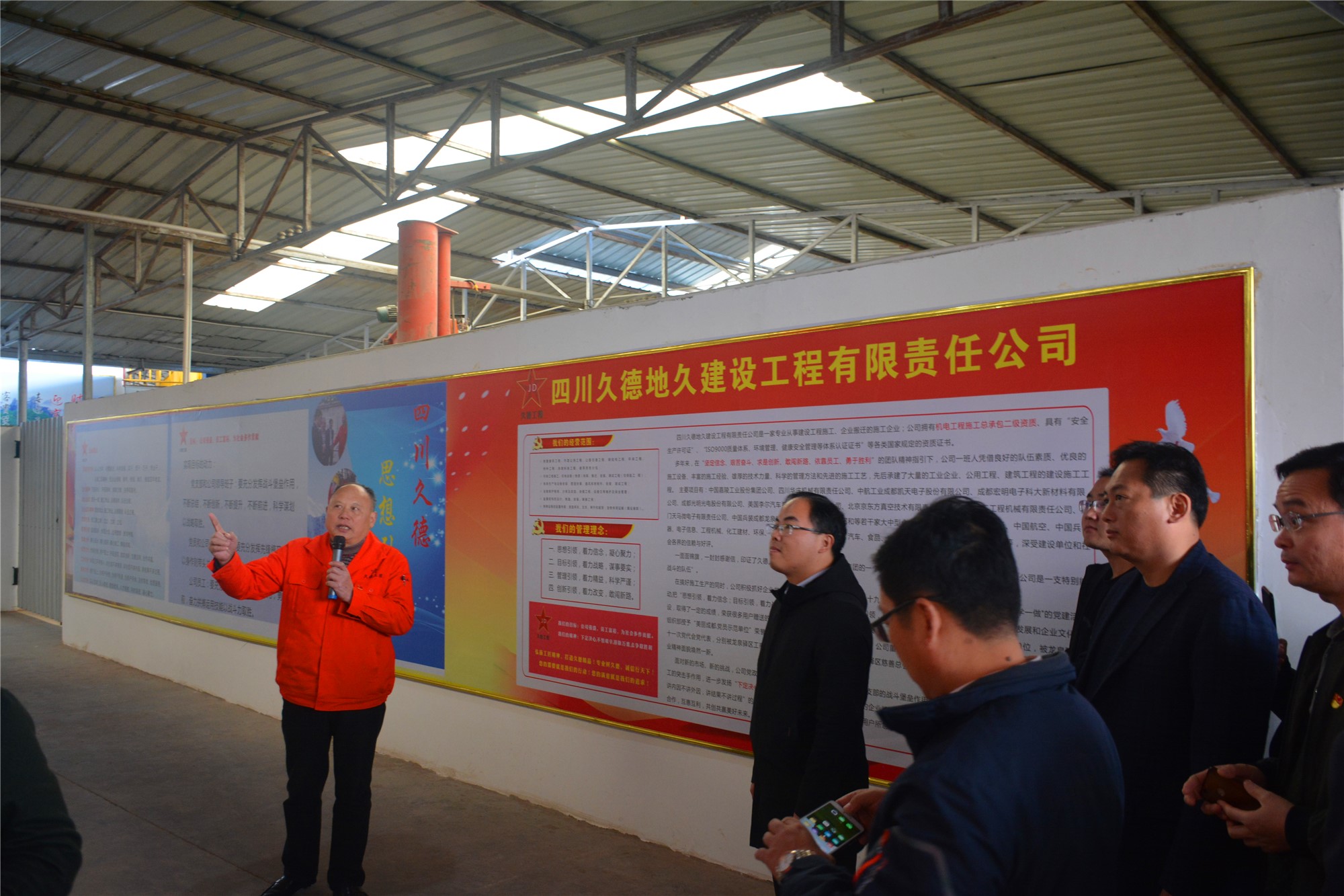 在四川久德党支部书记吴贡学同志的引导下,观摩团成员参观了四川久德的企业文化,库房、机具、物资管理情况。大家一边听,一边询问企业的生产经营情况,企业家和党组织书记们对四川久德党支部如何将企业发展与党建工作相融共生等问题产生了浓厚兴趣,相互之间进行了交流。吴贡学书记说,四川久德党建工作之所以能达到事半功倍的效果,这都要归功于党建工作“八个融入”的工作模式。即:一是党建工作要融入增强企业员工的思想引领及人生向往。 二是党建工作要融入加强企业的人才队伍建设。三是党建工作要融入提高企业项目施工的工作效率。四是党建工作要融入提高企业项目施工及工作质量的水平 。五是党建工作要融入加强企业的项目施工及生产安全的管控。 六是党建工作要融入增强企业的文化建设。 七是党建工作要融入提升企业服务市场档次的建设。 八是党建工作要融入驱动企业不断创新可持续发展。
