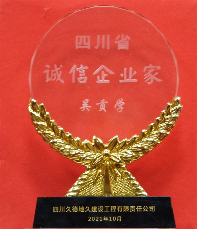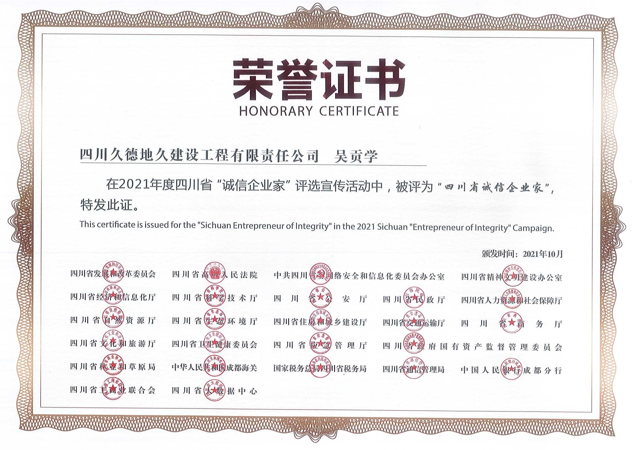这里涵盖了四川久德地久建设工程有限责任公司荣获的四川省“诚信企业”称号;公司董事长、总经理、党支部书记吴贡学同志荣获的四川省“诚信企业家”称号。