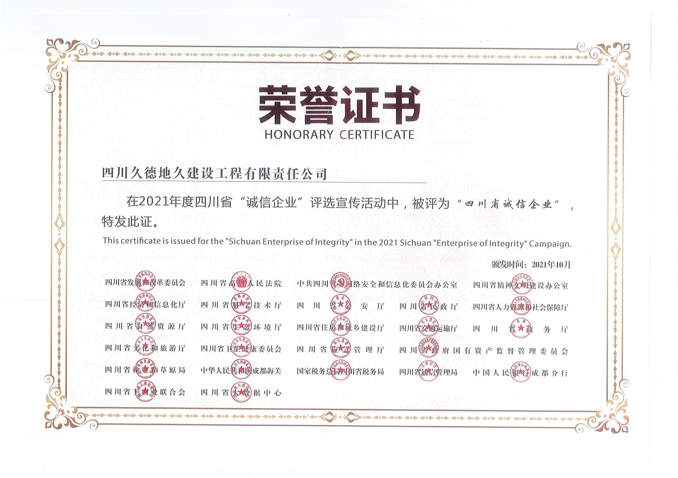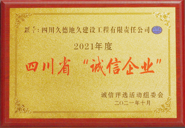 四川久德地久公司成立13来,一直都非常重视诚信体系建设,公司设置了质量、技术、安全、环保等部门,全体员工认真贯彻“用户至上,为用户着想,为用户所急,为用户所做,及时高效,优质服务”的服务方针,以诚实树立久德标杆,以守信创建久德品牌,为机电施工行业树立了诚信榜样。